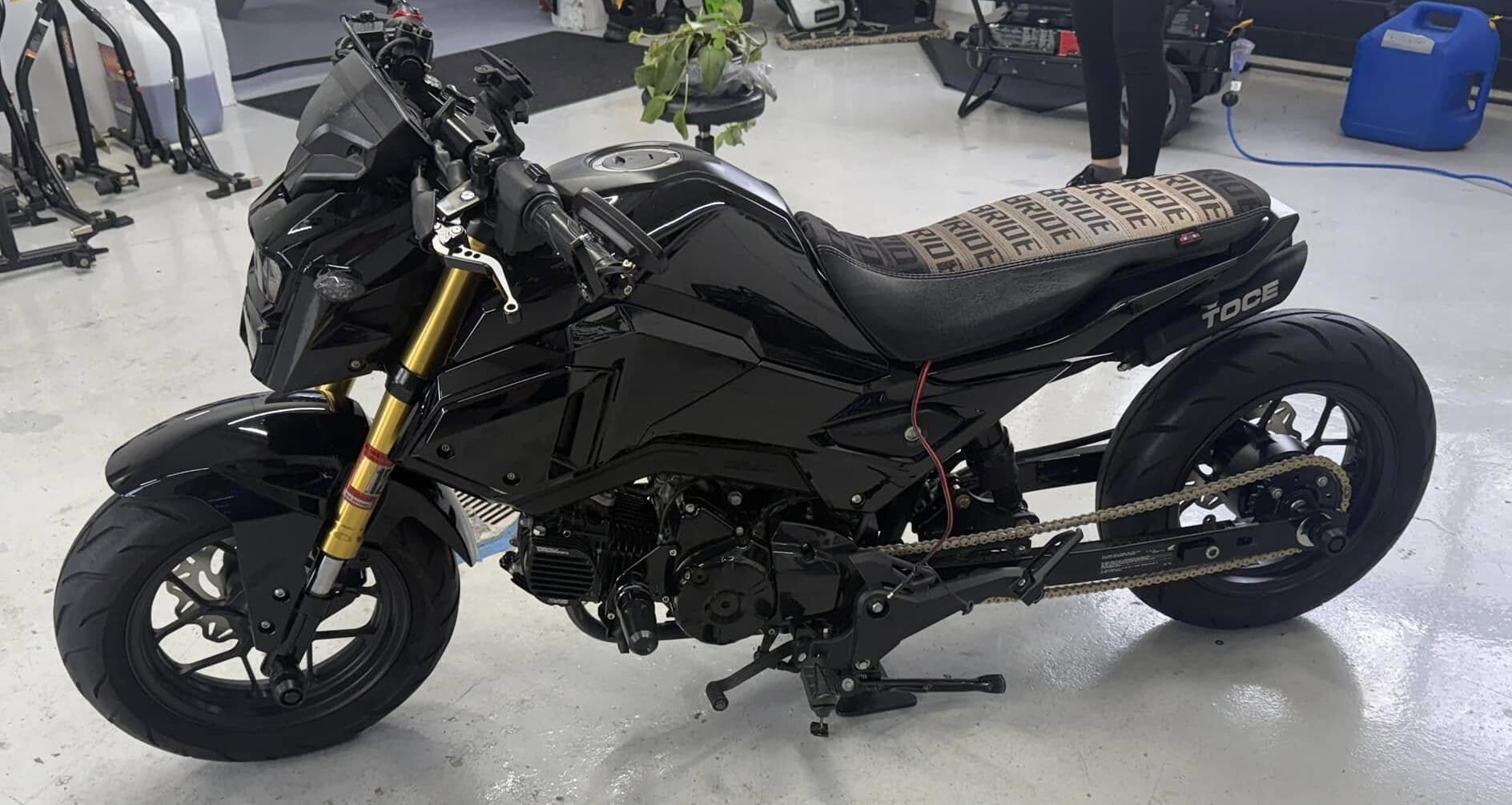 Stage 2 DHM ECU Flash, Decha Camshaft, Chimera Intake, Toce Exhaust, Magnum Elite Air ride with Handlebar Air Controls, Magnum Elite Center Stand, 2 Inch Front Fork Lowering Spring Kit, The Ruck Shop CNC Racerbar Handlebars, TRS Swingarm Extensions, EBC Wave Rotors Front and Rear, Kitaco Clutch Cover, EBC 15% Clucth Springs, CNC Billet Clutch Plate, HoBoa DROW Heat Sink Cam Gear Cover and Valve Covers, Shorty Levers, Bar End Mirrors, CNC Mirror Plugs, TST Integrated Taillight, LED Front Turn Signals, Bride Seat, Grom Frame Sliders, Axle Sliders, Black Rearsets, Swingarm Tag Bracket, Painted Calipers, Supersprox Black Steel Sprocket, Factory Gold Sprocket Nuts, RK Gold chain