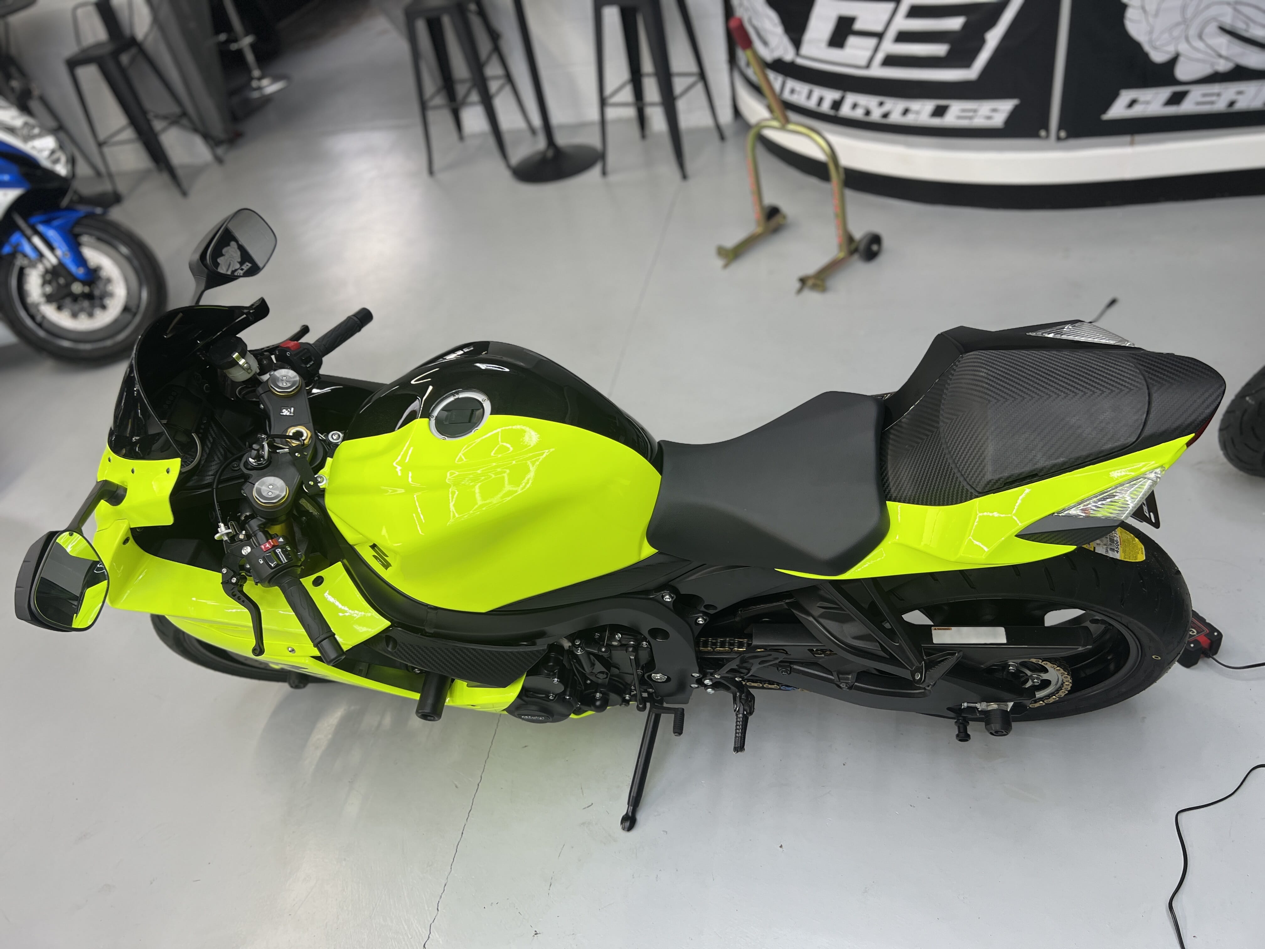 Custom High Vis/Black fairings, M4 Exhaust, K&N Air Filter, T-Rex Adjustable Rear Lowering Links, Lowered .5” up front, PSR Adjustable Kickstand, Shorty Levers, GB Engine Covers, Noco Battery, Shogun Frame Sliders, Shogun Bar Ends, Axle Sliders Front and Rear, Shogun Swing Arm Spools, Dunlop Tires, LED Headlight, Fender Eliminator